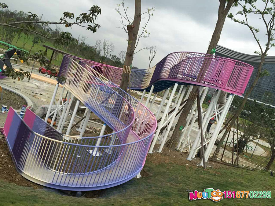 滑梯由平臺(tái)段、攀登段和下滑段三部分組成,一般采用不銹鋼、木材、人造水磨石、增強(qiáng)塑料、玻璃纖維等材料制作而成,滑板表面光滑。