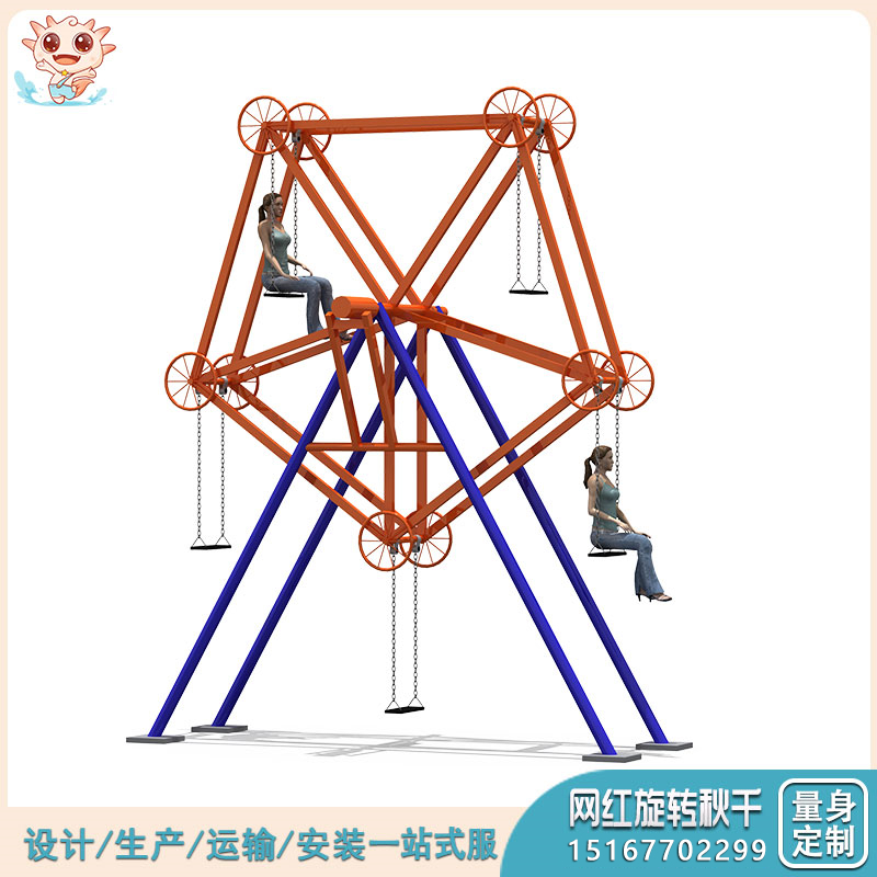 3,室外樂園可設單、雙或多人秋千,通過圓形或 S形等異形布置,營造豐富的秋千視野,這樣可以帶給游人更多的秋千氛圍感,在我們的建設中,有更多采用此種布置的秋千樂園,獲得明顯的好評,受到廣大游人群體的喜愛,還有一些整木秋千,被賦予一定的團隊拓展功能。