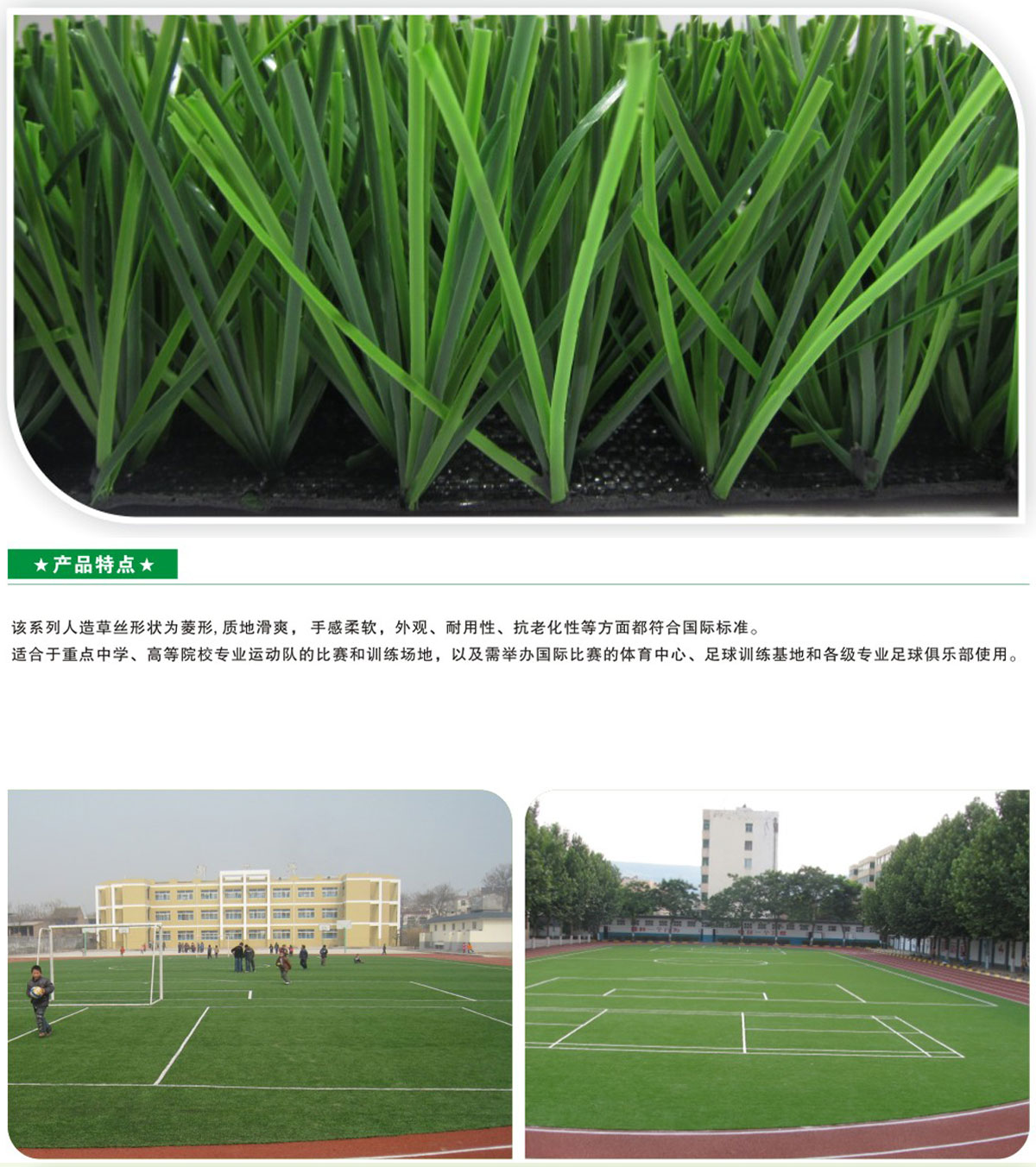 1,草坪外型美觀、色澤鮮艷、不褪色、堅固耐用,抗沖擊強(qiáng)度高。耐候性好,耐高溫、抗高寒、耐鹽霧、抗潮濕、免維修、易清洗、使用壽命長、一次性投入,可享用終生。
