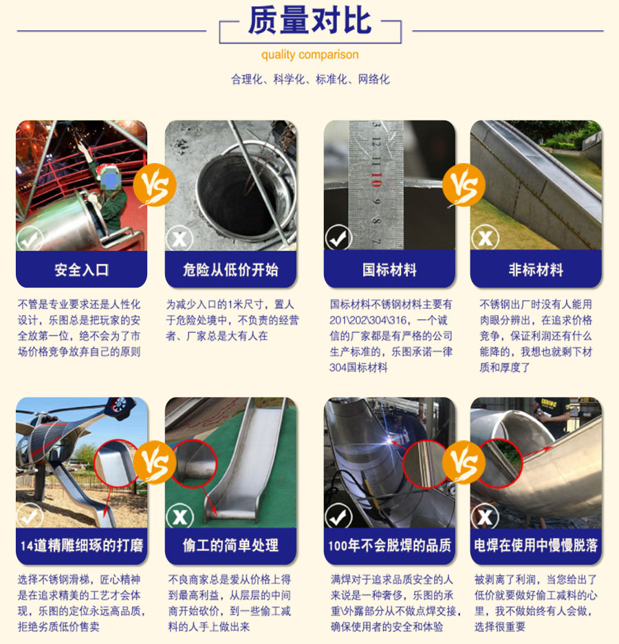 為什么市面上的不銹鋼滑梯 都使用304不銹鋼!首先,什么是304不銹鋼,304不銹鋼是不銹鋼中常見的一種材質,密度為7.93 g/cm3,業(yè)內也叫做18/8不銹鋼。耐高溫800度,具有加工性能好,韌性高的特點,廣泛使用于戶外游樂設施和水上游樂設備和食品醫(yī)療行業(yè)。市場上常見的標示方法中有06Cr19Ni10,SUS304,其中06Cr19Ni10一般表示國標標準生產(chǎn),304一般表示ASTM標準生產(chǎn),SUS 304表示日標標準生產(chǎn)。